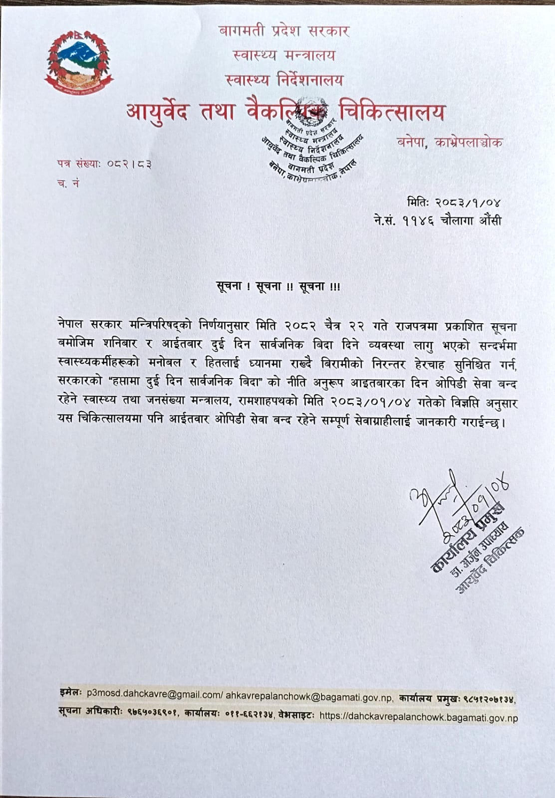 आयुर्वेद तथा वैकल्पिक चिकित्सालय, बनेपा, काभ्रेपलान्चोक।